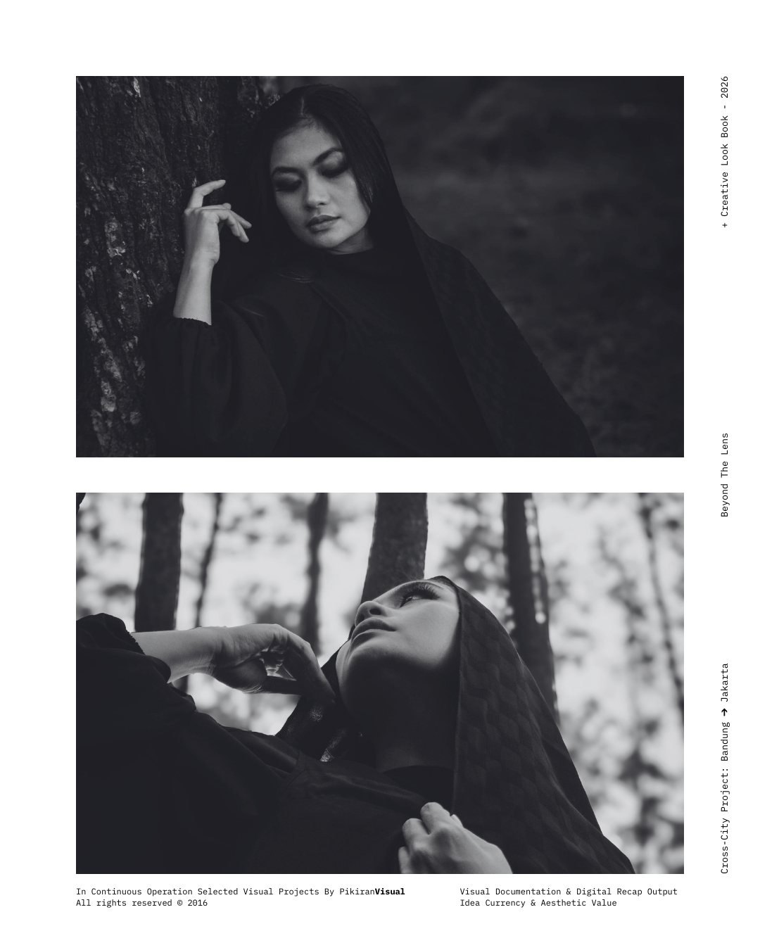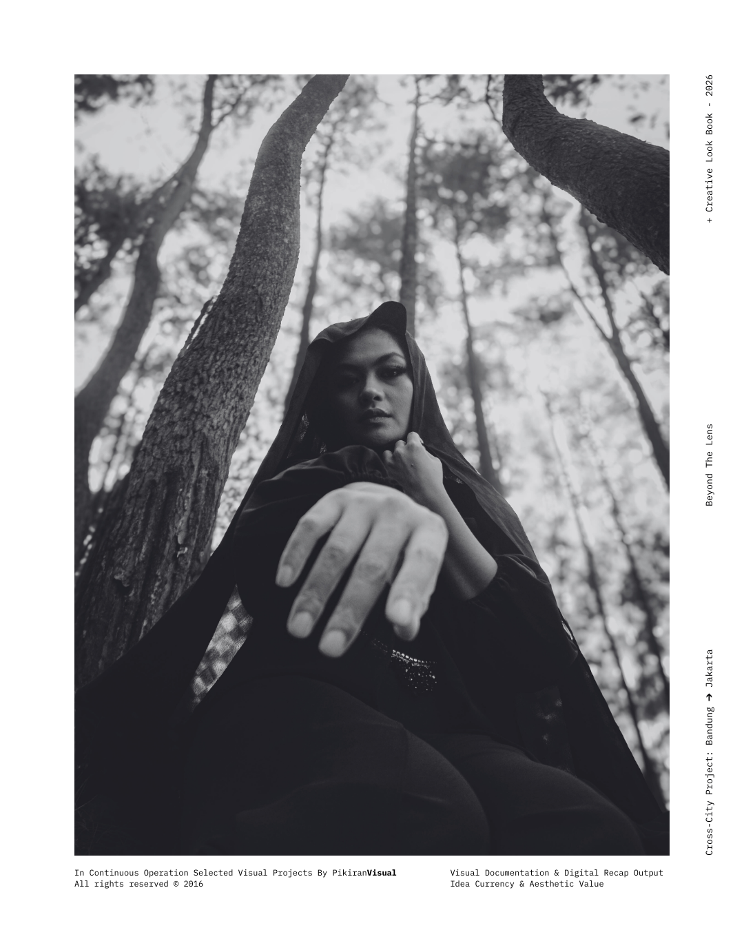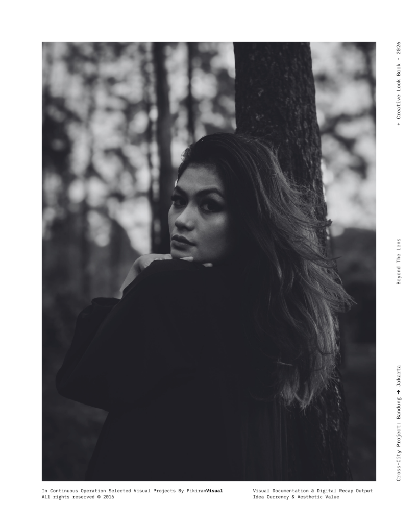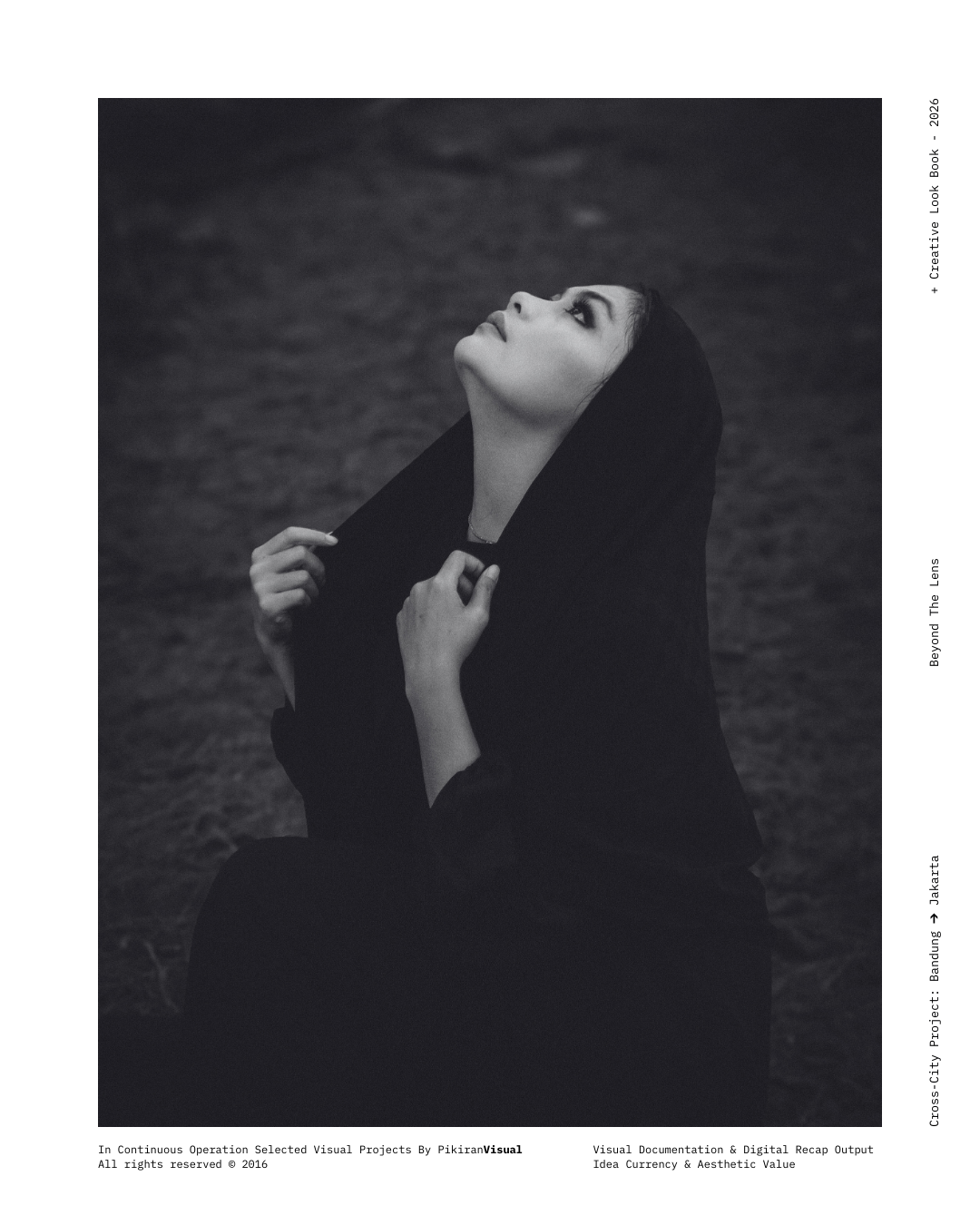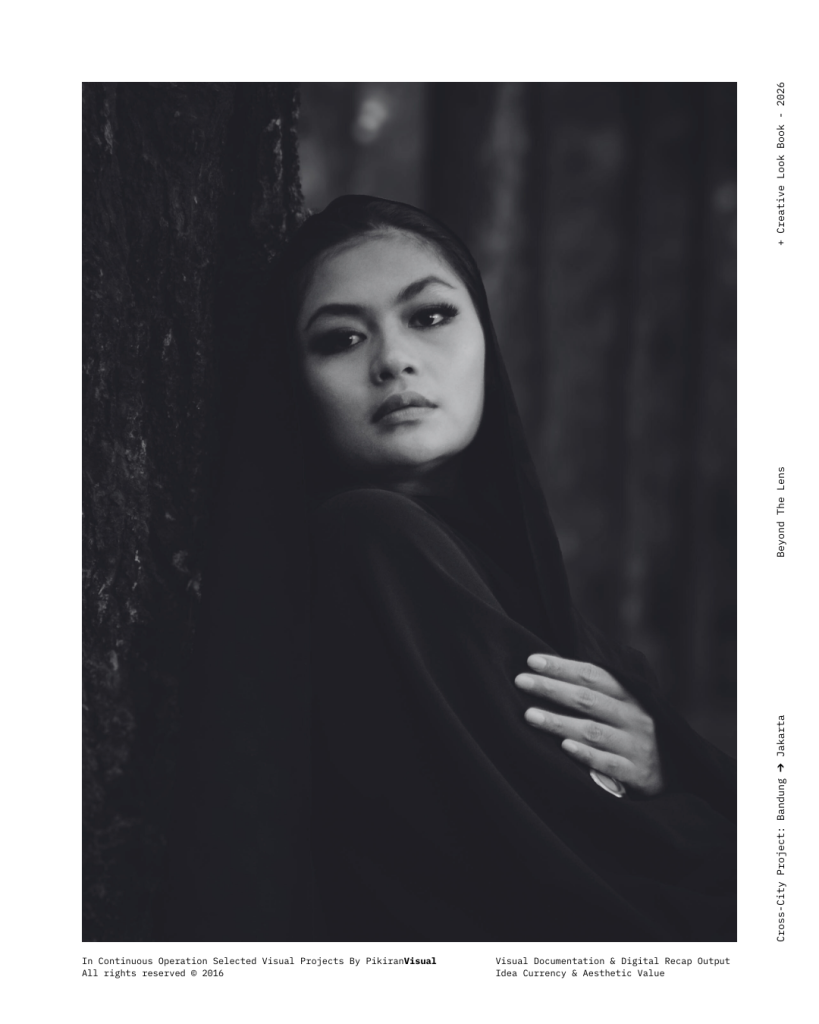 TECHNICAL EXECUTION Kami kembali menggunakan sensor Fujifilm yang dipadukan dengan lensa Nikkor 50mm f/1.8 untuk mendapatkan tekstur grain yang artistik dan transisi highlight-to-shadow yang lembut. Dengan memanfaatkan pencahayaan alami yang redup (ambient light), kami sengaja mempertahankan detail pada helai kerudung hitam untuk menciptakan dimensi, sembari memberikan fokus tajam pada mata subjek sebagai jendela utama narasi.